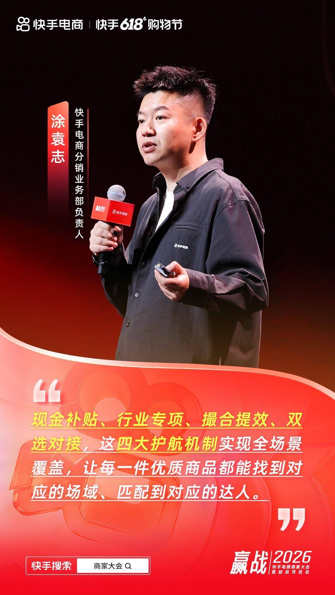 4月23日,"贏戰2026"快手電商超級雙選會在杭州舉辦。會上,快手電商分銷業務部負責人涂袁志圍繞《讓好商品找到好生意》主題,全面分享快手電商分銷生態發展成績及產品能力升級,并發布2026年分銷生態三大核心升級與資源投入計劃,攜手商達共建高效分銷生態。